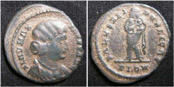 | Constantinople RIC VIII 48 | Helena, AE14, Constantinople. 337-340 AD. Posthumous issue. FL IVL HE-LENAE AVG, draped bust right with broad diadem / PAX PV-BLICA, Pax standing left, holding branch and transverse sceptre. Mintmark CONS epsilon. RIC VIII Constantinople 48. | Text | ![]() |