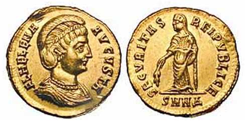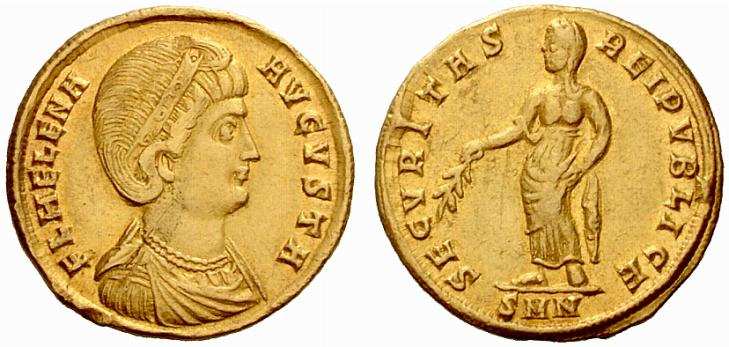 | Nicomedia RIC VII 79 | Helena, AV Solidus, Nicomedia. FL HELENA AVGVSTA, diademed, draped bust right / SECVRITAS REIPVBLICE, Securitas standing left, holding branch. Mintmark SMN. RIC VII Nicomedia 79; Sear 16588. | Text | ![]() |