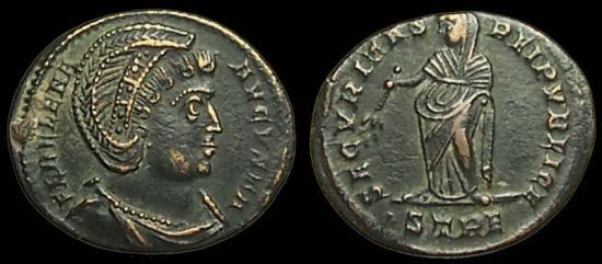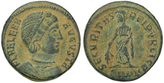 | Trier RIC VII 465 | Helena AE Follis. FL HELENA AVGVSTA, diademed and draped bust right / SECVRITAS REIPVBLICE, Securitas standing left, holding branch in right hand. Mintmark PTR crescent. Sear 16592. | Text | ![]() |