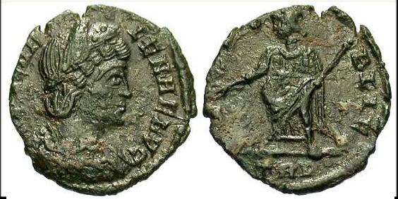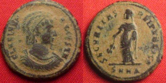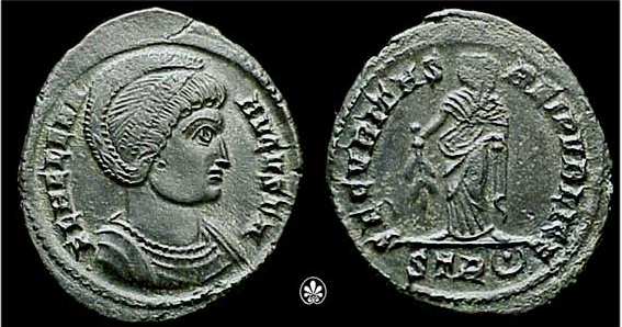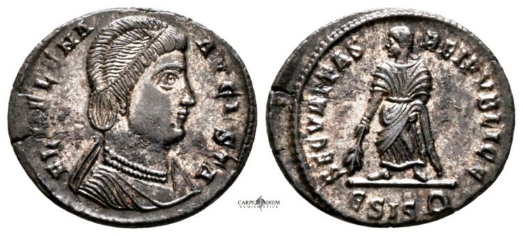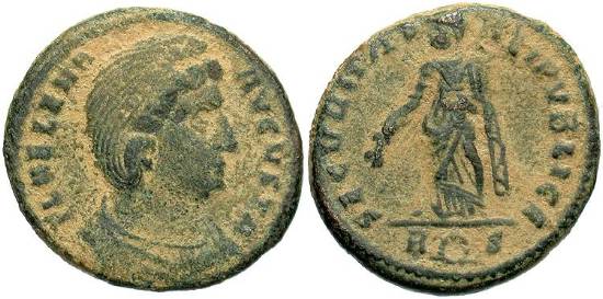 | Siscia RIC VII 204 | Helena, AE Follis, 3.04 gr, 20.02 mm. Siscia. 326-327 AD. FL HELENA-AVGVSTA, diademed, draped bust right / SECVRITAS-REIPVBLICE, Securitas standing left, lowering branch with right hand, raising hem of robe with left hand. Mintmark dot ΓSIS dot. RIC VII Siscia 204; Sear 16609. | Text | ![]() |