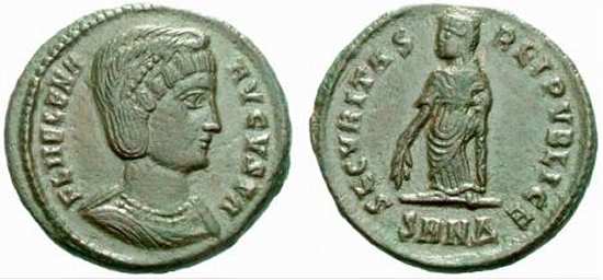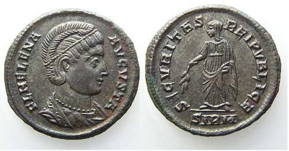 | Siscia RIC 218, E | Helena AE follis. Siscia. AD 328-329. FL HELENA AVGVSTA, diademed, mantled bust right, wearing necklace / SECVRITAS REIPVBLICE, Securitas standing left, lowering branch in right hand and raising hem of robe with left. Mintmark Epsilon SIS double-crescent. RIC VII Siscia 218; Sear 16610. | Text | ![]() |