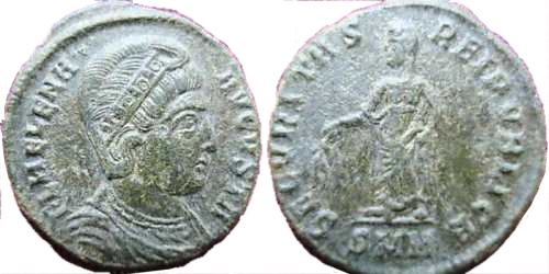| Nicomedia RIC 95 var | Helena, AE3 3.59 g; 18 mm, Nicomedia. FL HELENA AVGVSTA, draped bust right wearing broad band of pearls in hair / SECVRITAS REIPVBLICE, Securitas standing half left, branch pointed down in right, raising hem of robe with left. Mintmark SMN. RIC VII Antioch 95 var (no officina letter in mintmark); Sear 16619 var. | Text | ![]() |