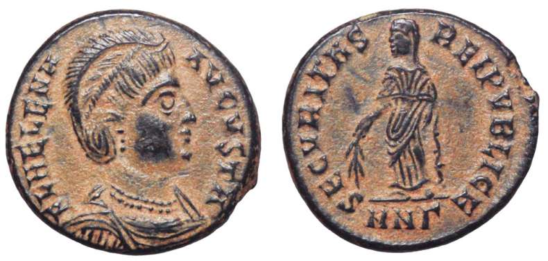 | Trier RIC 515, S | Helena. AE Follis. 327-328 AD. FL HELENA-AVGVSTA, diademed bust right, wearing mantle and necklace / SECVRITAS-REIPVBLICE, Securitas standing left, lowering branch with right hand, raising hem of robe with left hand. Mintmark dot STRE. Sear 16594. | Text | ![]() |