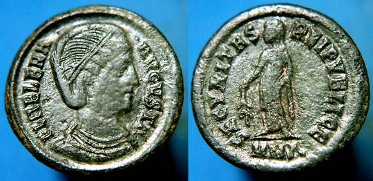 | Thessalonica RIC 159, E | Helena, AE follis, Thessalonica. AD 318-319. FL HELENA AVGVSTA, diademed, mantled bust right, wearing necklace / SECVRITAS REIPVBLICE, Securitas standing left, lowering branch and raising hem of robe. Mintmark SMTS Epsilon. RIC VII Thessalonica 159; Sear 16612. | Text | ![]() |