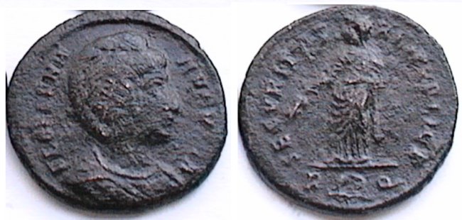 | Heraclea RIC 95, B | Helena, AE follis Heraclea. FL HELENA AVGVSTA, diademed and mantled bust right / SECVRITAS REIPVBLICE, Securitas standing left, lowering branch with right hand, raising hem of robe with left hand. Mintmark: dot SMHB. RIC VII Heraclea 95. | Text | ![]() |