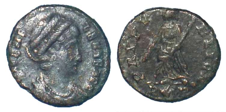 | Siscia RIC 218, Γ | Helena AE3. AD 328-329. FL HELENA AVGVSTA, diademed, mantled bust right, wearing necklace. / SECVRITAS REIPVBLICE, Securitas standing left, lowering branch with right hand, raising hem of robe with left hand. Mintmark ΓSIS double-crescent. Sear 16610. | Text | ![]() |