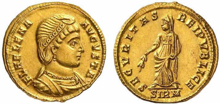 | Sirmium RIC VII 60 | Helena, AV Solidus, Sirmium. FL HELENA AVGVSTA, diademed, draped bust right / SECVRITAS REIPVBLICE, Securitas standing left, holding branch. Mintmark SIRM. RIC VII Sirmium 60; Cohen 11; Depeyrot 9/6; Sear 16586. | Text | ![]() |