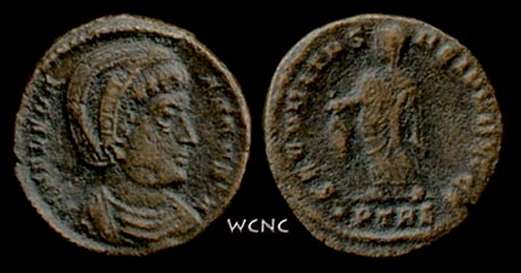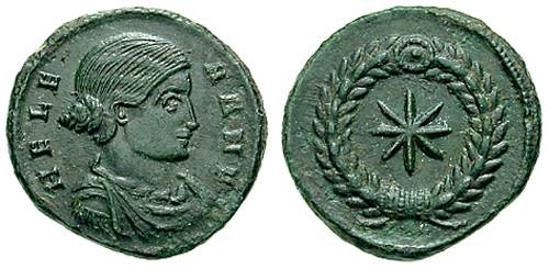 | Thessalonica RIC 50 | Helena AE Follis. AD 318-319. HELENA AVG, draped bust right / no legend, eight-pointed star in laurel wreath. No mintmark. RIC VII 50 of Thessalonica, Cohen 14, LRBC 821; Sear 16583. | Text | ![]() |