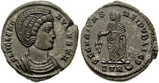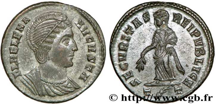 | Trier RIC 508, S | Helena AE Follis. FL HELENA-AVGVSTA, diademed bust right wearing mantle and necklace / SECVRITAS-REIPVBLICE, Securitas standing left, lowering branch and raising hem of robe. Mintmark STRE. Sear 16594. | Text | ![]() |