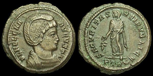 | Trier RIC 481, P | Helena AE Follis. FL HELENA AVGVSTA, diademed and draped bust right / SECVRITAS REIPVBLICE, Securitas standing left, holding branch in right hand. Mintmark PTR dot in crescent. LRBC 35; Sear 16593. | Text | ![]() |