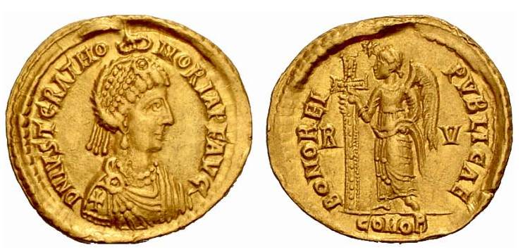 | RIC 2022 | Justa Grata Honoria (sister of Valentinian III) AV Solidus. Ravenna mint. D N IVST GRAT HONORIA P F AVG, Diademed, draped bust right, hand of God holding crown above / BONO REIPVBLICAE, angel standing left, holding long cross, star in upper left field, R-V across field. Mintmark COMOB. RIC 2022, Cohen 1, Depeyrot 15/1, DO 866; Sear 21371. | Text | Image |