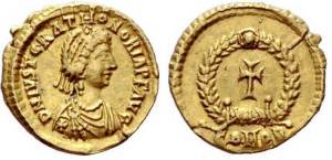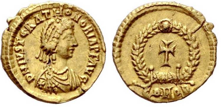 | RIC 2068 | Justa Grata Honoria, AV Tremissis. Rome or Ravenna mint, 439 AD. D N IVST GRAT HONORIA P F AVG, diademed & draped bust right, in necklace / cross within wreath. Mintmark COMOB. Depeyrot 47/10, DOCLR 868; Sear 21376. | Text | Image |