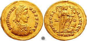 | Thessalonica RIC X 359 | Honorius AV Solidus. DN HONORIVS PF AVG, three-quarter facing bust of Honorius, helmeted, cuirassed, holding spear over shoulder and a shield with a horseman on it / CONCORDIA AVGG, Constantinoplis seated facing, looking right, holding Victory on globe and sceptre, right foot on prow. Mintmark TES dot OB. RIC X 259; Sear 20907. | Text | Image |