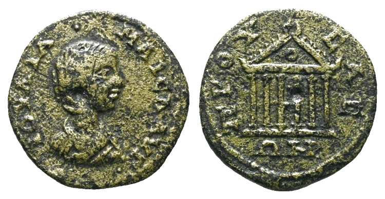 | Prusa ad Olympum Rec Gen 134 | Julia Maesa, AE21 of Prusa ad Olympum, Bithynia, AD 218-222. 4.7 g. IOYΛIA MAICA AYΓ, draped bust right. / ΠΡOYCAEΩN, hexastyle temple. RecGen 134; BMC 29; Lindgren I 187. | Text | Image |