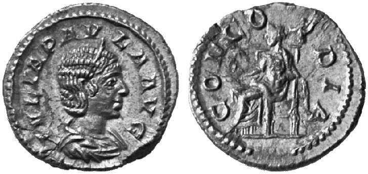 | RIC 211 Sear 7655 | Julia Paula Denarius. 220 AD. IVLIA PAVLA AVG, draped bust right / CONCORDIA, Concordia seated left, holding patera; star in left field. RSC 6. | Text | ![]() |