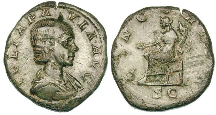 | RIC 381 Sear 7660 | Julia Paula AE Sestertius. 220 AD. IVLIA PAVLA AVG, diademed draped bust right / CONCORDIA, Concord seated left with patera and double cornuacopiae, star before, SC in ex. Cohen 8. | Text | ![]() |