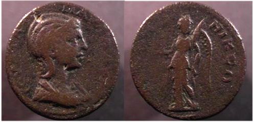| Thessalonica Moushmov 6774 | Julia Paula AE25 of Thessalonika, Macedonia. IOYΛIA ΠAYΛA AVT, draped bust right / ΘECCAΛONIKEΩN, Nike walking left, holding wreath and palm branch. SGI 3130. | Text | ![]() |