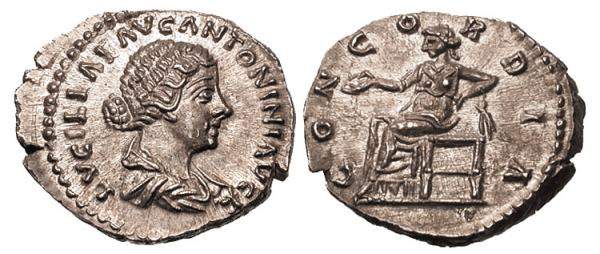 | RIC 759 | Lucilla, AR denarius. LVCILLA AVGVSTA, draped bust of Lucilla right / CONCORDIA, Concordia enthroned left, holding patera and cornucopiae. RIC 759; Cohen 7. | Text | Image |