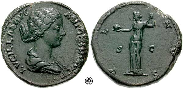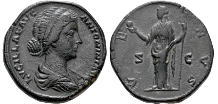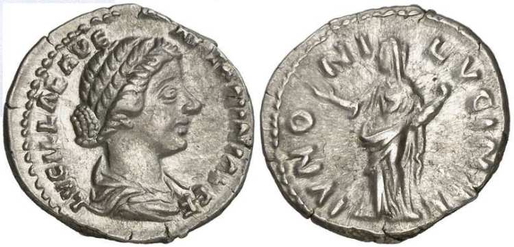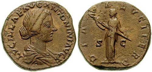 | RIC 1748 | Lucilla, AE sestertius, struck by Marcus Aurelius, 164-169 AD. LVCILLAE AVG ANTONINI AVG F, draped bust right / IVNONI LVCINAE, S-C, Juno, veiled, standing left, extending right hand and holding an infant wrapped in swaddling clothes. RIC 1748; Cohen 39; BMC 1153; Sear 5503. | Text | Image |