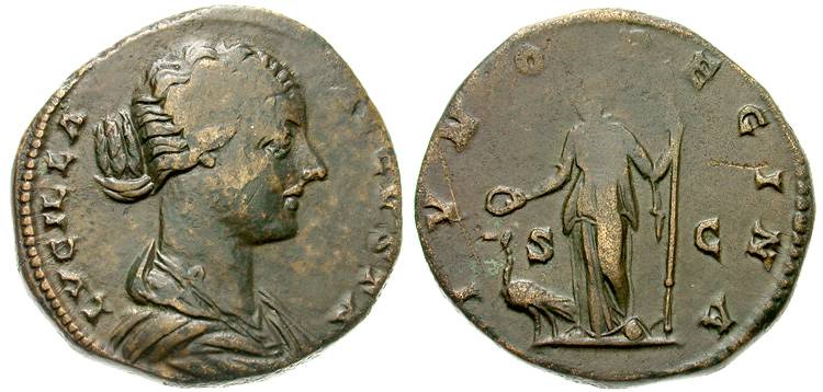 | RIC 1751 Sear 5502 | Lucilla AE Sestertius. LVCILLA AVGVSTA, draped bust right / IVNO REGINA S-C, Juno standing left, holding patera and sceptre, peacock at feet. | Text | Image |