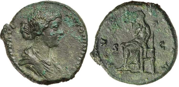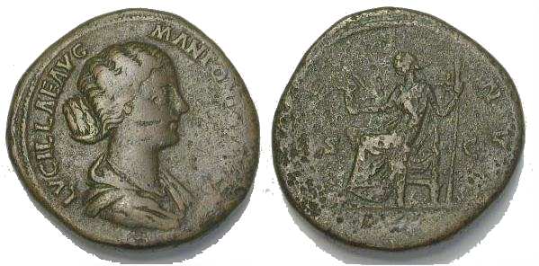 | RIC 1759 Sear 5520 | Lucilla AE Dupondius. LVCILLAE AVG ANTONIANI AVG F, draped bust right / PVDICITA S-C, Pudicitia seated left, right hand raised to her mouth. Cohen 64; Sear 5520. | Text | Image |