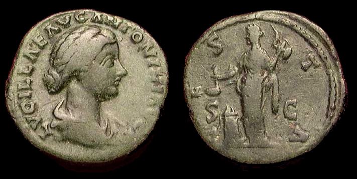 | RIC 1781 | Lucilla AE Dupondius or As. AD 164-182. 10.53 g. LVCILLAE AVG ANTONINI AVG F, draped bust right / VENVS, S-C across fields, Vesta standing left, holding simpulum and palladium. (no altar). RIC 1781; Cohen 96; Sear 5527. | Text | Image |