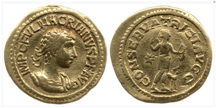 | RIC 1 | Macrianus, AV aureus. Antioch mint. AD 260-261. 5.1 g. IMP C FVL MACRIANVS P F AVG, laureate, draped and cuirassed bust right. / CONSERVATRICI AVG, Diana, draped, standing right, holding bow, reaching for an arrow from the quiver at her shoulder, stag at her side. Star in left field. RIC 1; BMC 1923,1015.7; Sear 10795. | Text | ![]() |