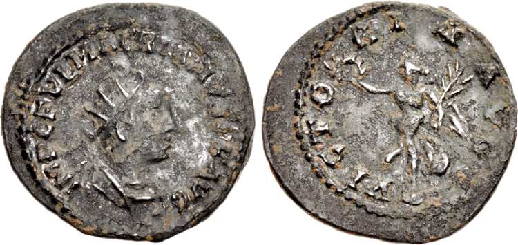 | RIC 14 Goebl 1745c | Macrianus, AE antoninianus, AD 260-261. Uncertain mint. 23 mm, 4.7 g. IMP C FVL MACRIANVS PF AVG, radiate and cuirassed bust right. / VICTORIA AVGG, Victory standing left on globe, holding wreath and palm branch. RIC 14 var (direction of Victory); MIR missing as 1745c; Cunetio –. | Text | ![]() |