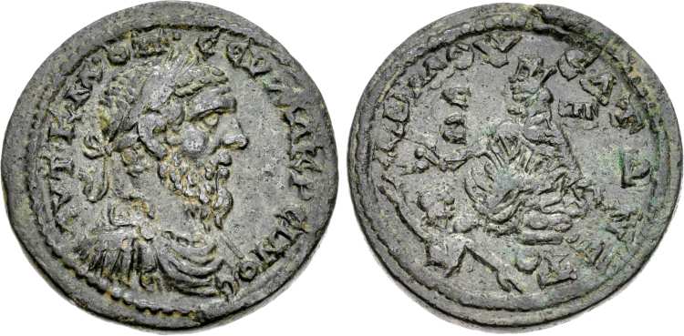 | Tarsos SNG Levante 1077 | Macrinus, AE32 of Tarsos, Cilicia. 16.5g. AVT K M OΠE CEY MAKΡEINOC, laureate, draped bust right / (CEYH MA)KΡEININANHC TAΡCOY, AMK above, Helios, radiate and naked, in galloping quadriga left, holding whip and raising hand. SNG Levante 1077; SNG von Aulock 6021; SNG Lewis 1742; SNG Pfalz VI 63. | Text | Image |