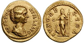 | RIC 7a Cohen 1 Sear 6081 | Manlia Scantilla AV Aureus. MANLIA SCANTILLA AVG, draped bust right / IVNO REGINA, Juno standing left, holding patera and sceptre, peacock at feet standing left. RIC 7a; Cohen 1. Sear 6081. | Text | Image |