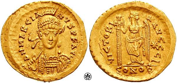 | RIC 510, Z | Marcian AV Solidus. Constantinople mint. D N MARCIA-NVS P F AVG, diademed, helmeted and cuirassed three-quarter facing bust, holding spear over shoulder and shield decorated with horseman / VICTORI-A AVGGG and officina letter Z, Victory standing left, holding long jewelled cross, star in right field. Mintmark CONOB. | Text | Image |