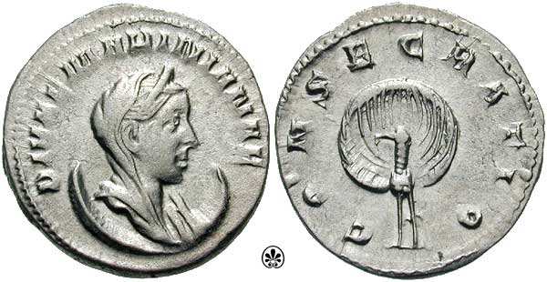 RIC 4 | Mariniana, AR antoninianus, 21mm, 3.49 gr. 254-258 AD, Viminacium. DIVAE MARINIANAE, veiled and draped bust right on crescent / CONSECRATIO, peacock standing, head right, tail in splendour. RIC 4; Goebl 213b; Sear 10068. | Text | Image |