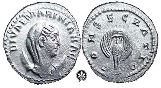 RIC 6 | Mariniana AR Antoninianus. DIVAE MARINIANAE, veiled and draped bust right on crescent / CONSECRATIO, peacock flying right, carrying Mariniana, veiled, with raised hand and sceptre. RSC 16; Goebl 220b; Sear 10070-10071. | Text | Image |