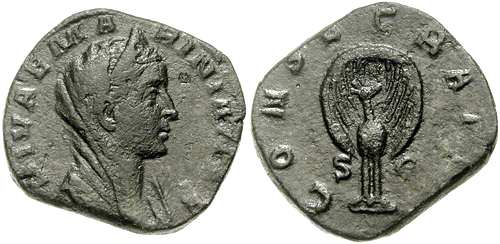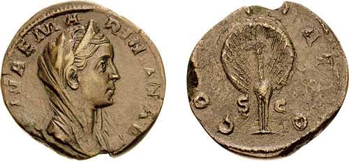 RIC 9v | Diva Mariniana, wife of Valerian I, AE Sestertius. Rome mint. DIVAE MARINIANAE, veiled, diademed and draped bust right / CONSECRATIO S-C, Peacock in splendour facing, head left. RIC 9 var (position of peacock's head). | Text | Image |