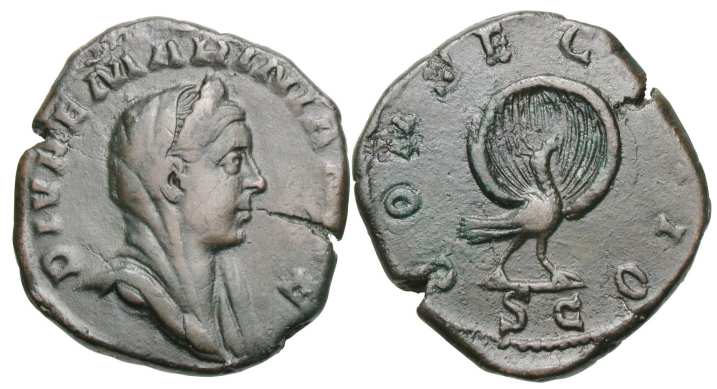RIC 9 | Mariniana. AD 256. AE Sestertius. DIVAE MARINIANAE. Diademed and veiled bust right / CONSECRATIO, Peacock in splendour facing, looking right; S-C across fields. RIC 9 (obv. corr.); Cohen 7; Sear 10073. | Text | Image |