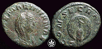 RIC 11cf | Diva Mariniana AE As. Struck 257 AD. Draped and veiled bust right on crescent / Peacock standing facing, head right, tail spread, Q below. | Text | Image |