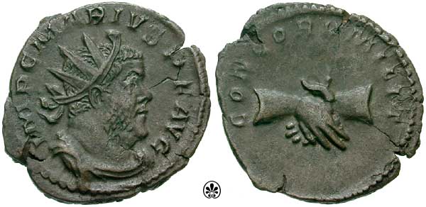 | RIC 6 | Marius AE Antoninianus. Cologne mint. IMP C MARIVS P F AVG, radiate, draped & cuirassed bust right / CONCORD MILIT above or beneath clasped hands. RIC 6; Cohen 4; Sear 11119. | Text | ![]() |