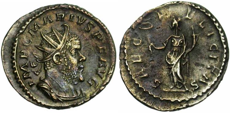 | RIC 7 | Marius, AE antoninianus. 20mm, 269 AD, Cologne. IMP C MARIVS P F AVG, radiate, draped, cuirassed bust right / CONCORDIA MILITVM, clasped hands. RIC 7; Cohen 4; Elmer 632; Schulzki 3b; Sear 11119. | Text | ![]() |