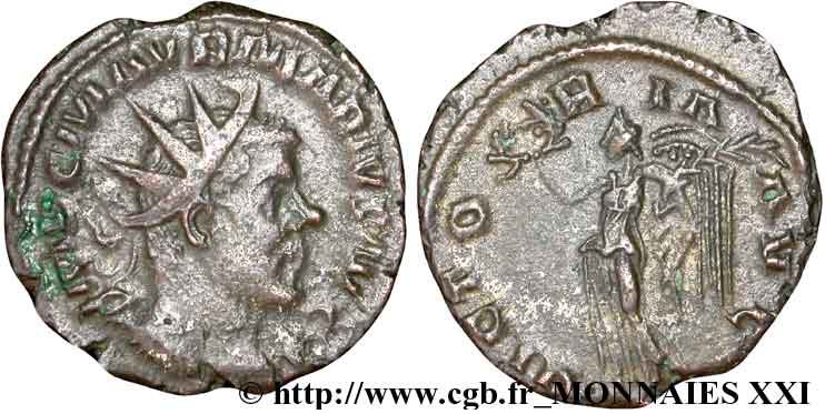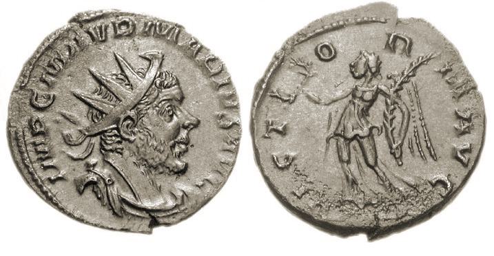 | RIC 18 | Marius, AE antoninianus, 19mm, Cologne, 269 AD. IMP C M AVR MARIVS AVG, radiate, cuirassed bust right / VICTORIA AVG, Victory advancing right, holding wreath and palm. RIC 18. C. 20. Elmer 636. | Text | ![]() |