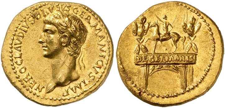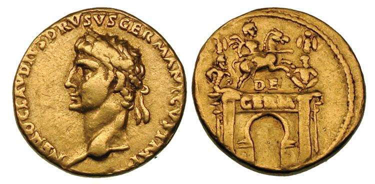 | RIC 72 Aureus | Nero Claudius Drusus, AV Aureus. 46 AD. NERO CLAVDIVS DRVSVS GERMANICVS IMP, laureate head left / Triumphal arch surmounted by Nero Claudius Drusus on horseback and two trophies of captured arms, DE GERMANIS on arch. RIC 72; Hill p50; Kek p280; Kampmann 6.2. | Text | Image |
