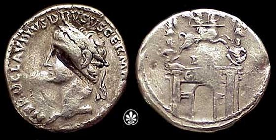 | RIC 72 Sear 1894 | Nero Claudius Drusus Denarius. NERO CLAVDIVS DRVSVS GERMANICVS IMP, laureate head left / triumphal arch surmounted by Nero Claudius Drusus on horseback and two trophies of captured arms, DE GERMANIS on arch. RSC 4. | Text | Image |