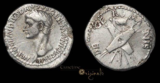 | RIC 74 | Nero Claudius Drusus, father of Claudius, AR denarius, struck 41-45 AD under Claudius. NERO CLAVDIVS DRVSVS GERMANICVS IMP, laureate head of Nero Claudius Drusus left / DE GERMANIS, two crossed, oblong shields, two pairs of spears and two trumpets, in front of an upright vexillum with still flag. RIC 74; BMC 107; Cohen 6; RSC 6. | Text | Image |