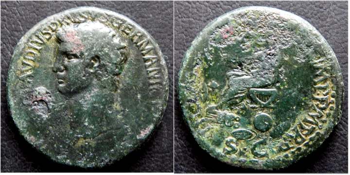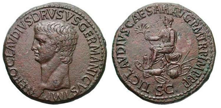 | RIC 93 Sear 1896 | Nero Claudius Drusus AE Sestertius. NERO CLAVDIVS DRVSVS GERMANICVS IMP, bare head of Claudius' father, left / TI CLAVDIVS CAESAR AVG P M TR P IMP, Claudius togate, seated left on curule chair, holding branch, shields and arms around; SC in ex. RIC 93; BMCRE 157. | Text | Image |