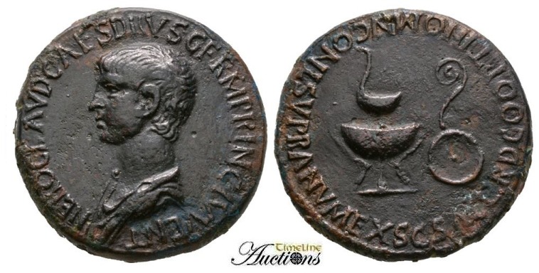 | RIC 107 | Nero Claudius Drusus, AE dupondius, uncertain mint in Thrace. AD 51-54, struck under Claudius. 15.80 g. NERO CLAVD CAES DRVS GERM PRINC IVVENT, bare-headed, draped bust left / SACERD COOPT IN OMN CONL SVPRA NVM EX S C, sacrificial implements. RIC 107 (Claudius); BMCRE 242 bis; von Kaenel, 39-40. | Text | Image |