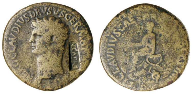 | RIC 109 BMC 210 | Nero Claudius Drusus AE Sestertius. Struck 41–42 AD. NERO CLAVDIVS DRVSVS GERMANICVS IMP, bare head left [countermark NCAPR in incuse rectangle behind] / TI CLAVDIVS CAESAR AVG PM TR P IMP P P, Claudius (or Drusus) seated left on curule chair, holding branch, surrounded by arms, SC in ex. | Text | Image |