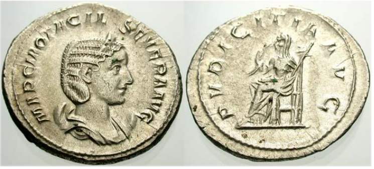 | RIC 123c Sear5 9159 | Otacilia Severa AR Antoninianus. MARCIA OTACIL SEVERA AVG, diademed draped bust right on crescent / PVDICITIA AVG, Pudicita seated left, raising veil, holding sceptre. RIC 123c, RSC 53. | Text | ![]() |