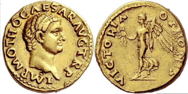 | RIC 15 | Otho, 15 January – mid April 69, Aureus. IMP M OTHO CAESAR AVG TR P, bare head right / VICTORIA OTHONIS Victory, draped, alighting left, holding wreath and palm branch over left shoulder. RIC I, 15; Cohen 23; BMC 23; Calicó 535. | Text | Image |