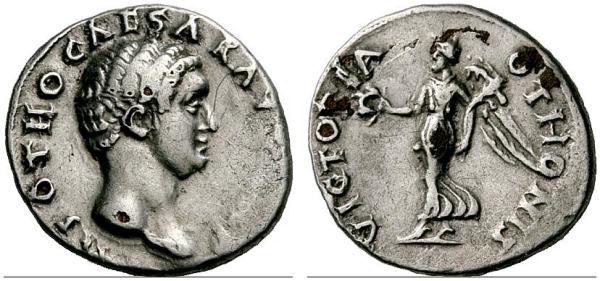 | RIC 16v | Otho, AR Denarius, Rome, Jan.-April 69 AD. IMP OTHO CAESAR AVG TR P, bare head right / VICTORIA OTHONIS, Victory walking left, holding wreath and palm branch. RIC I, 16 var. (Obv legend with this reverse); BMCRE 24 var.; Probably an ancient forgery. | Text | Image |