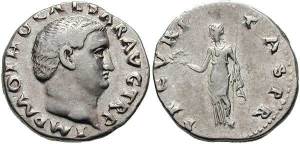 | RIC 24 Sear 2161 | Otho AR denarius. AD 69. IMP OTHO CAESAR AVG TR P, bare head right / PONT MAX, Vesta seated left, holding patera and transverse sceptre. RIC 24; RSC 7. | Text | Image |