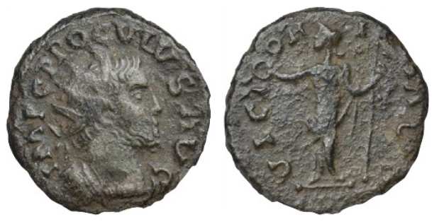 | M&M 1994, 640 | Proculus, AE Antoninianus. Usurper 280-281 AD. Unknown Gallic mint. IMP C PROCVLVS AVG, radiate, cuirassed bust right / (VI)CTORIA AV(G), female figure standing left, holding wreath and sceptre. | Text | Image |